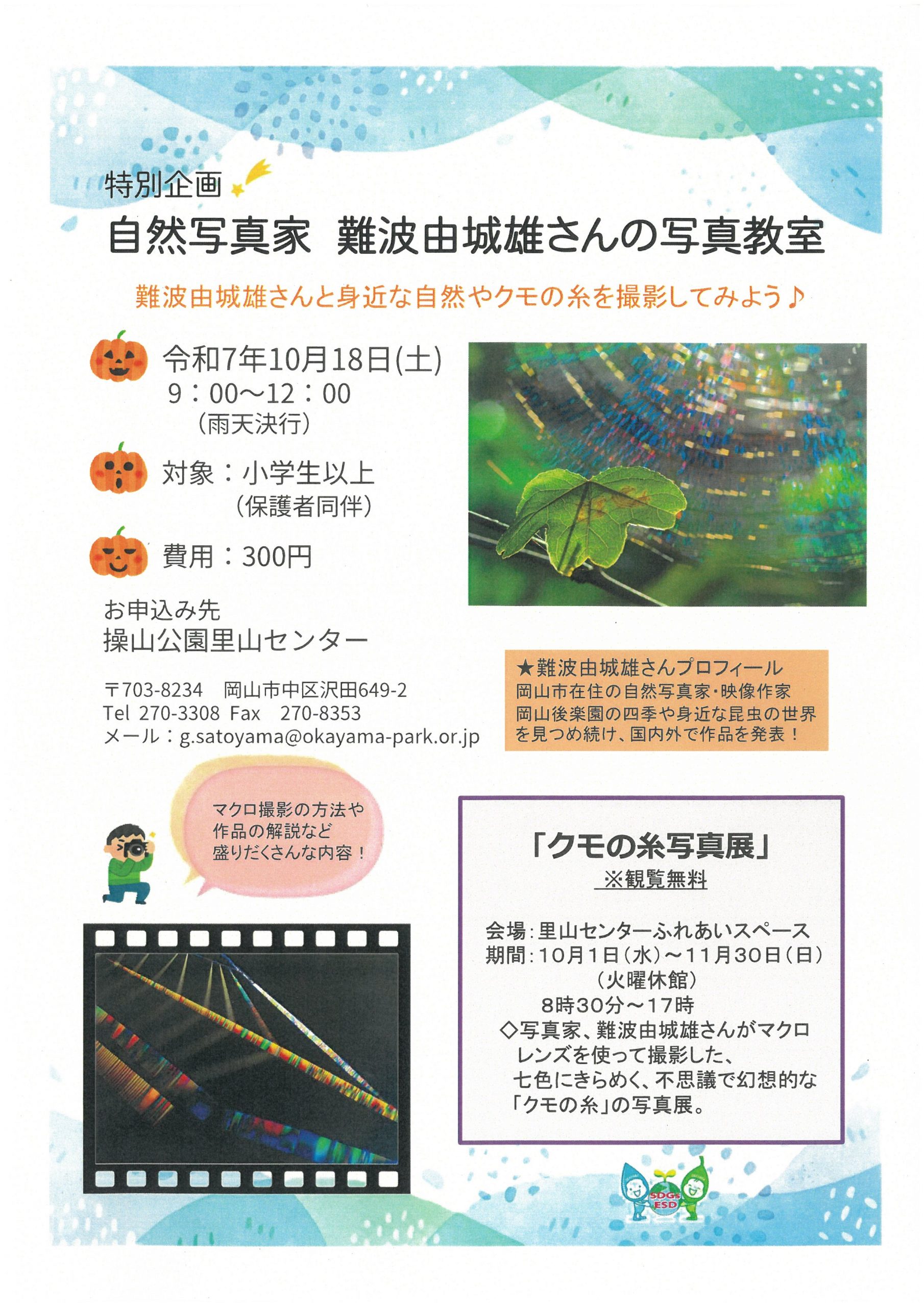 2025.10.1 操山公園里山センター 特別企画「自然写真家 難波由城雄さんの写真教室」と「クモの糸写真展」のご案内 難波さんと身近な自然やクモの糸を撮影してみよう! 撮影の方法や作品紹介など盛りだくさん。皆様のご参加をお待ちしています! 10月1日より「クモの糸写真展」も開催中。幻想的な写真をぜひご覧ください♪