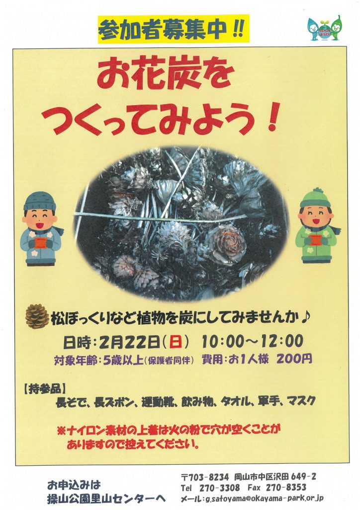2026.2.11 操山公園里山センター 2/22(日) 「お花炭をつくってみよう!」のご案内 お花炭って何だろう🤔 「松ぼっくりやどんぐりなどの木の実や葉っぱを使い、作った炭のこと」 ”飾り炭”とも呼ばれて、観賞用にも使われます。 火を囲み、暖をとりながらお花炭をつくってみませんか?