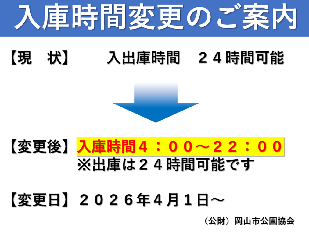 2026.3.1 総合文化体育館 駐車場入庫時間変更のお知らせ 総合文化体育館・テニスコート・野球場の 入庫時間が変わります。 【現 状】 24時間入出庫可能 【変更後】入庫時間 4:00~22:00 出庫時間は変わりません。 【変更日】 2026年4月1日予定 お知らせ用チラシはこちら
